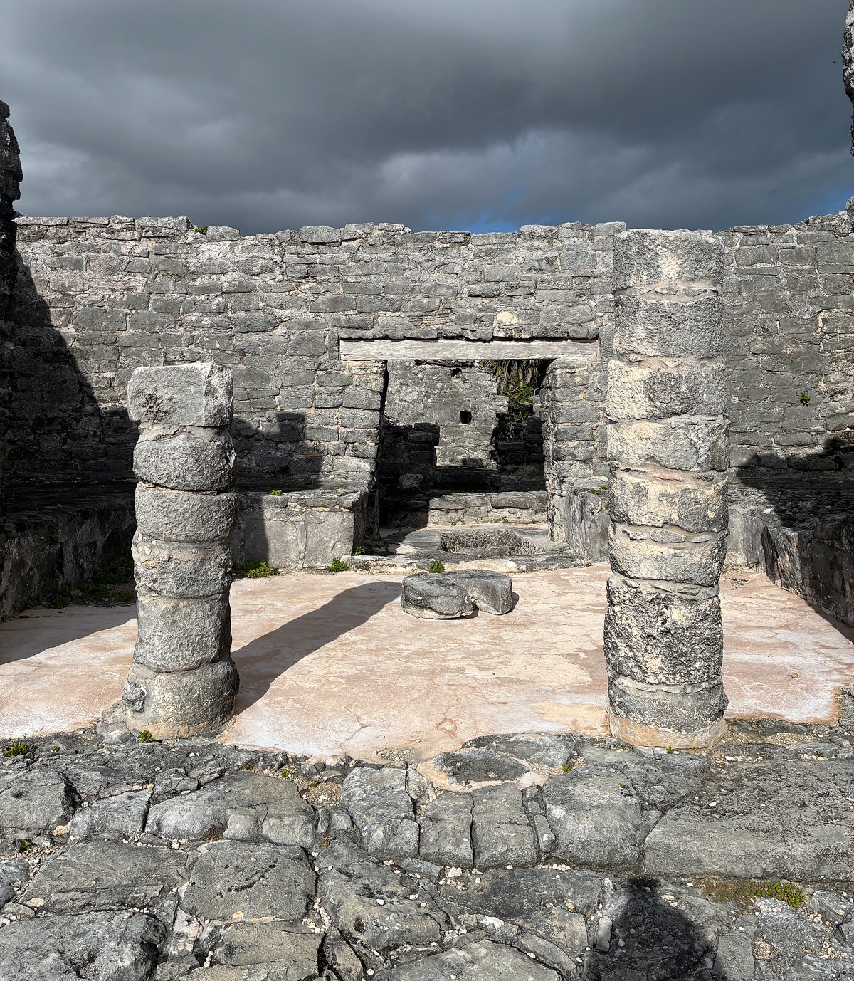 A thick limestone wall, (seven meters thick) surrounds the ruins on three sides, with the Caribbean creating the fourth protective barrier.